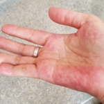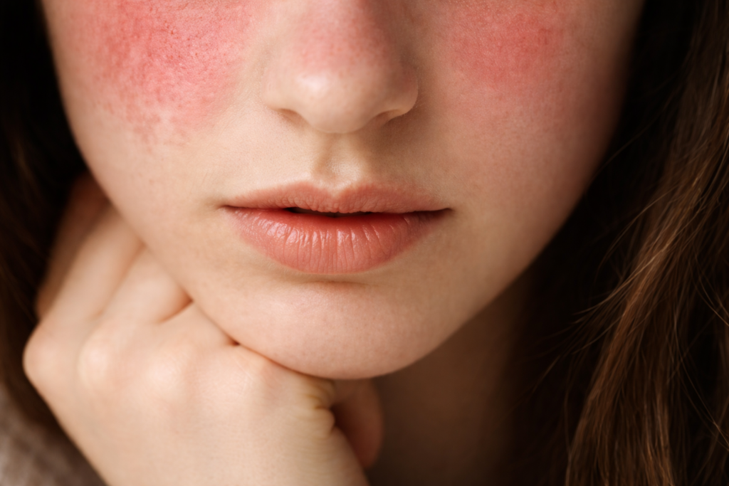 - Mancha em “asa de borboleta”: Uma vermelhidão que aparece nas bochechas e sobre o nariz, geralmente após exposição solar.