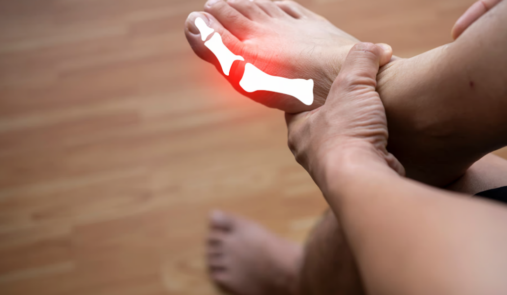 - Dor articular súbita e extrema: Geralmente começando na base do grande dedo do pé (hálux), mas também comum em tornozelos, joelhos e mãos.